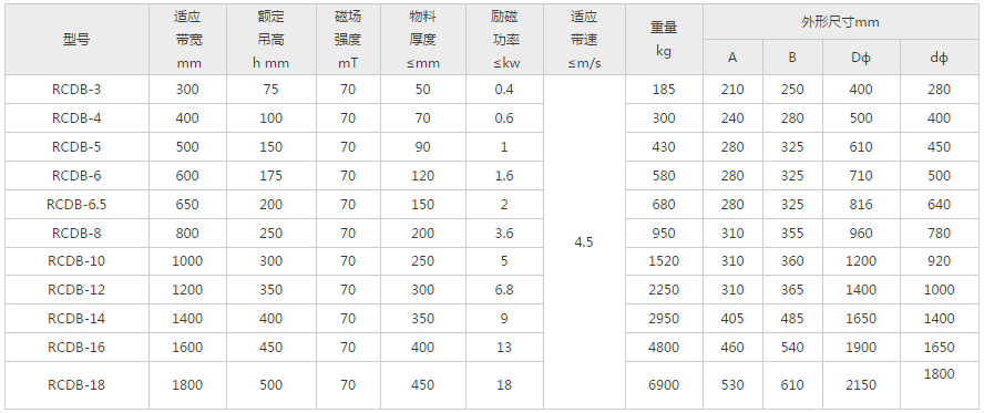 RCDB型自冷盤式電磁除鐵器與PDC系列盤式電磁除鐵器、RCDY系列電磁除鐵器等同。是用于清除粉狀或塊狀非磁性物料中雜鐵的除鐵裝置。其內(nèi)部采用電工專用樹脂澆注,自冷式全密封結(jié)構(gòu),具有透磁深度大、吸力強(qiáng)、防塵、防雨、耐腐蝕等特點(diǎn),在極其惡劣的環(huán)境中仍能可靠運(yùn)行。行走裝置的配備可由客戶自己選擇。