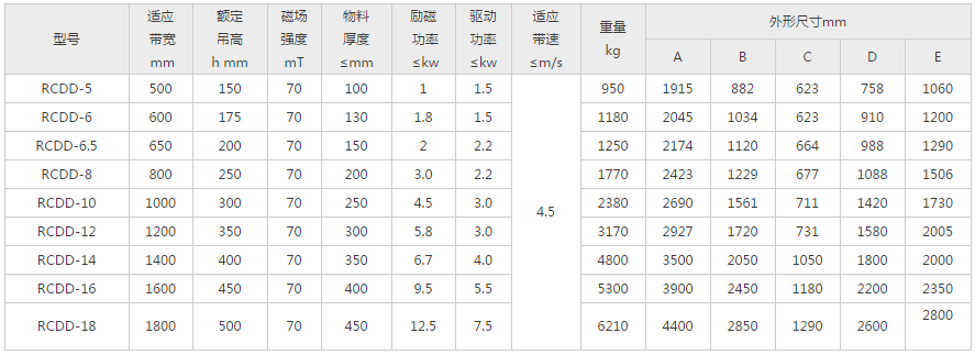 RCDD型自冷自卸式電磁除鐵器是一種用于自動清除粉狀或塊狀非磁性物料中雜鐵的除鐵裝置。其內部采用電工專用樹脂澆注,自冷式全密封結構。具有透磁深度大、吸力強、防塵、防雨、耐腐蝕、皮帶可自動糾偏等優點,在極其惡劣的環境中仍能可靠運行。
