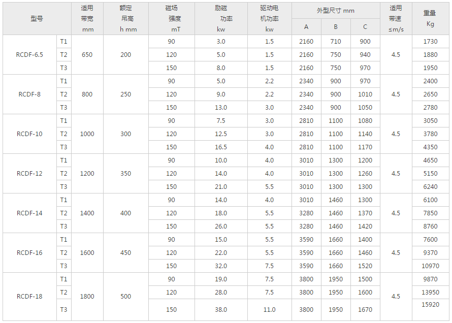 RCDF型油冷自卸式電磁除鐵器是在RCDE系列除鐵器的基礎(chǔ)增加了驅(qū)動電機、滾筒、帶刮板的卸鐵膠帶等組成的卸鐵機構(gòu)。具有磁力大、散熱快、防塵、防雨、耐腐蝕、連續(xù)工作、維護費用低等優(yōu)點。