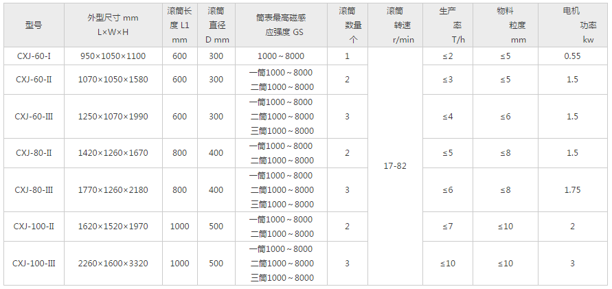 CXJ型筒式干粉磁分離機(jī)(從單筒到三筒)是一種從干性粉料中連續(xù)自動(dòng)除鐵的磁選設(shè)備,其內(nèi)部采用獨(dú)特的磁路設(shè)計(jì),由高性能永磁王釹鐵硼材料作為磁源,磁場強(qiáng)、吸力大、除鐵率高,入料方式采用專門設(shè)計(jì)的勻速振動(dòng)給料裝置,入料均勻,更利于進(jìn)入磁選區(qū)后的分離。具有免維護(hù)、節(jié)約能源、使用安全可靠等特點(diǎn),可調(diào)整控制進(jìn)料量,適用于不同顆粒的要求。