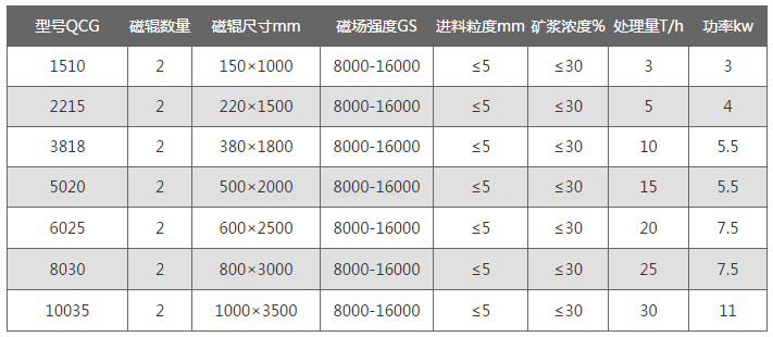 QCG輥式磁選機(jī)的作業(yè)原理為物料經(jīng)料倉通過導(dǎo)料盤進(jìn)入磁場區(qū),磁性礦物被吸附在磁輥表面旋轉(zhuǎn)到達(dá)精礦區(qū),毛刷將吸附在磁輥表面上的磁性礦刷脫,在高壓水的噴射下落到精礦斗里,部分未被吸附的磁性礦粒、非磁性礦粒和磁性較弱的礦粒進(jìn)入到下一級再選,最多個(gè)實(shí)現(xiàn)10輥組合,可對物料進(jìn)行多達(dá)10次的分選,特別是對強(qiáng)磁性、中磁性、弱磁性共存礦物有顯著的分選效果。